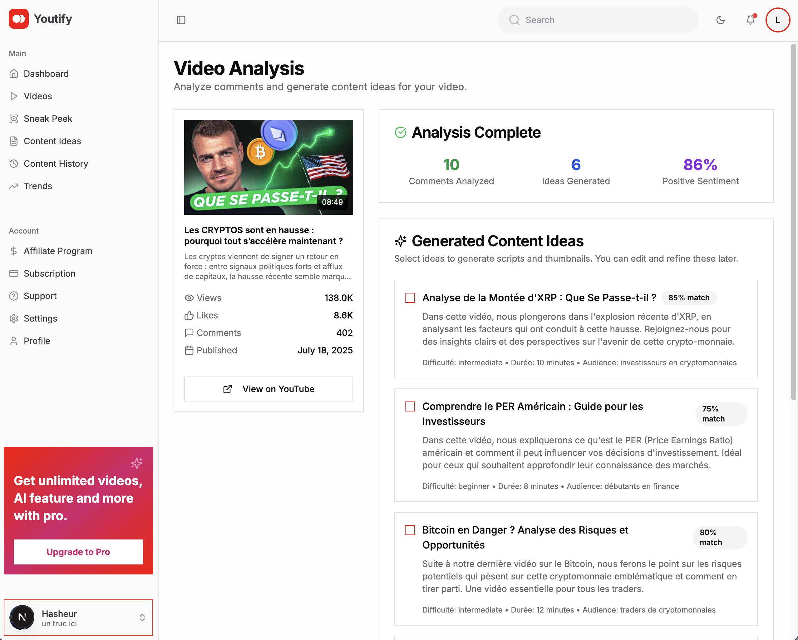 Get SEO-optimized titles, detailed scripts, and 3 AI-generated thumbnails ready for your next video.